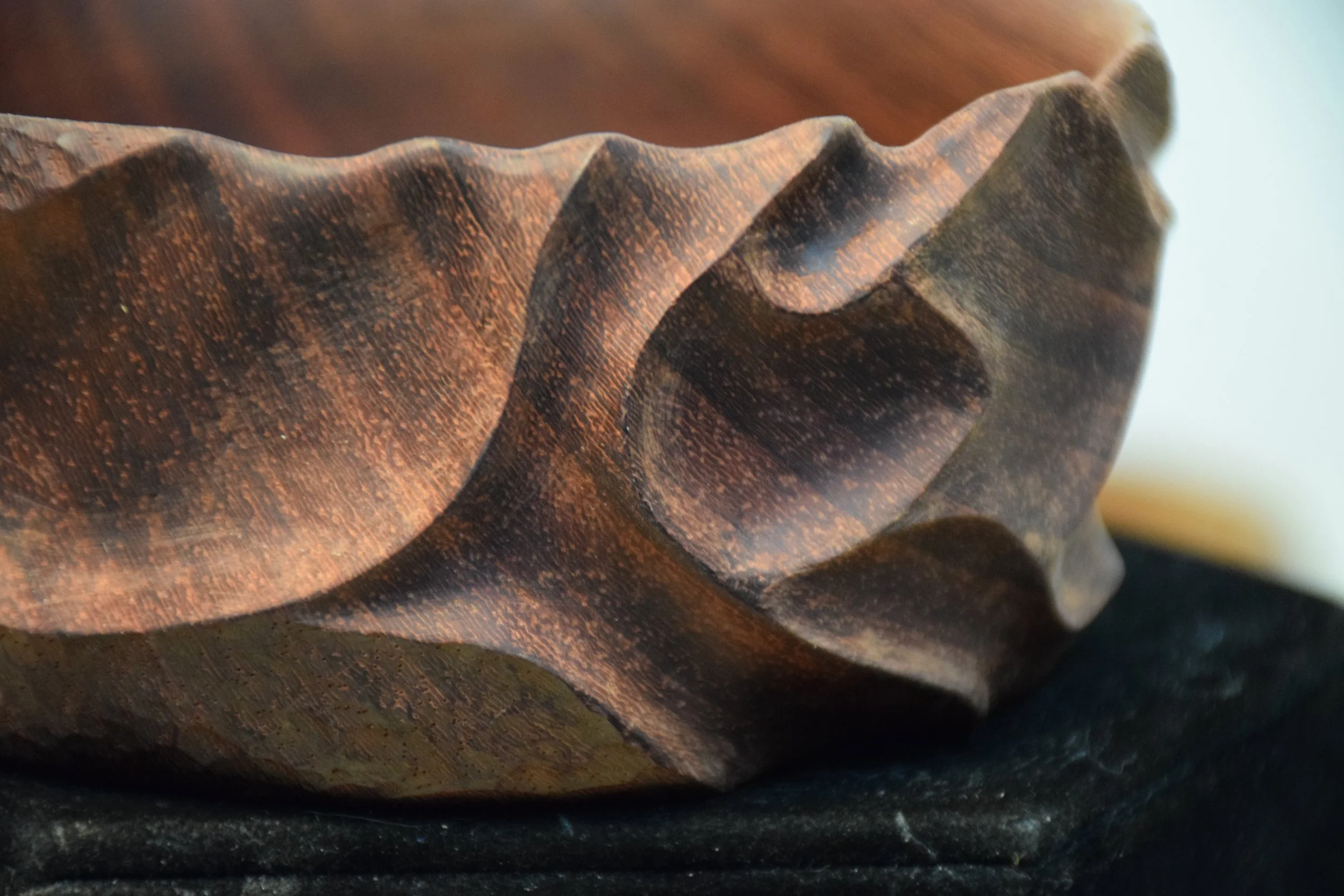Your choice of domestic or exotic wood, exterior texture carved by hand to smooth sanded finish, raw cut finish, or a combination of the two. Option of gemstone or precious metal inlays available.