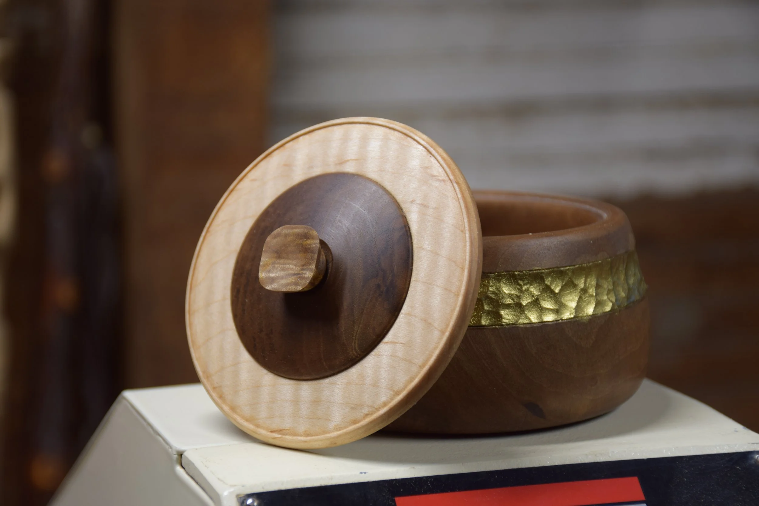 Walnut vessel with 3 piece walnut & figured maple lid. hand carved decorative band with bronze finish